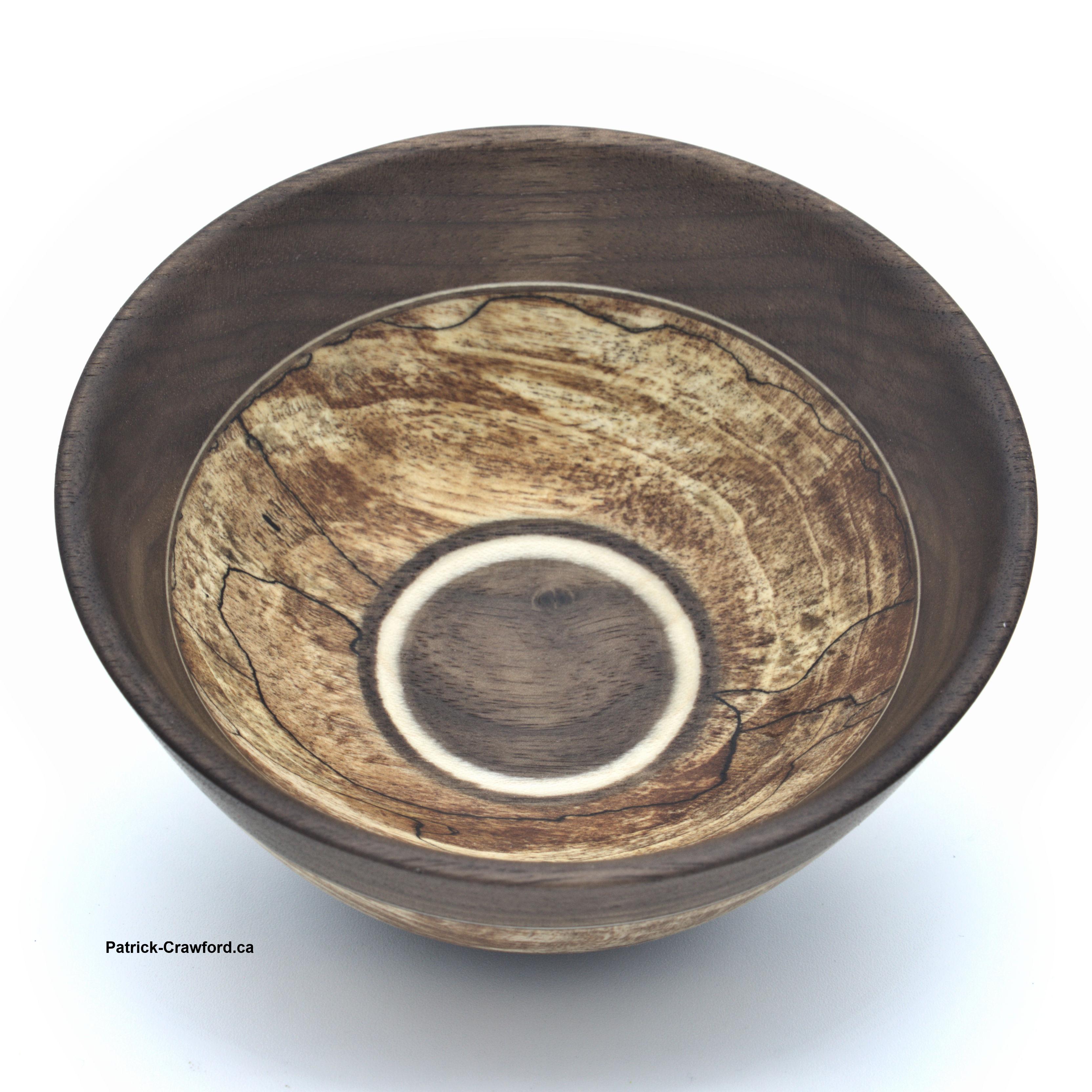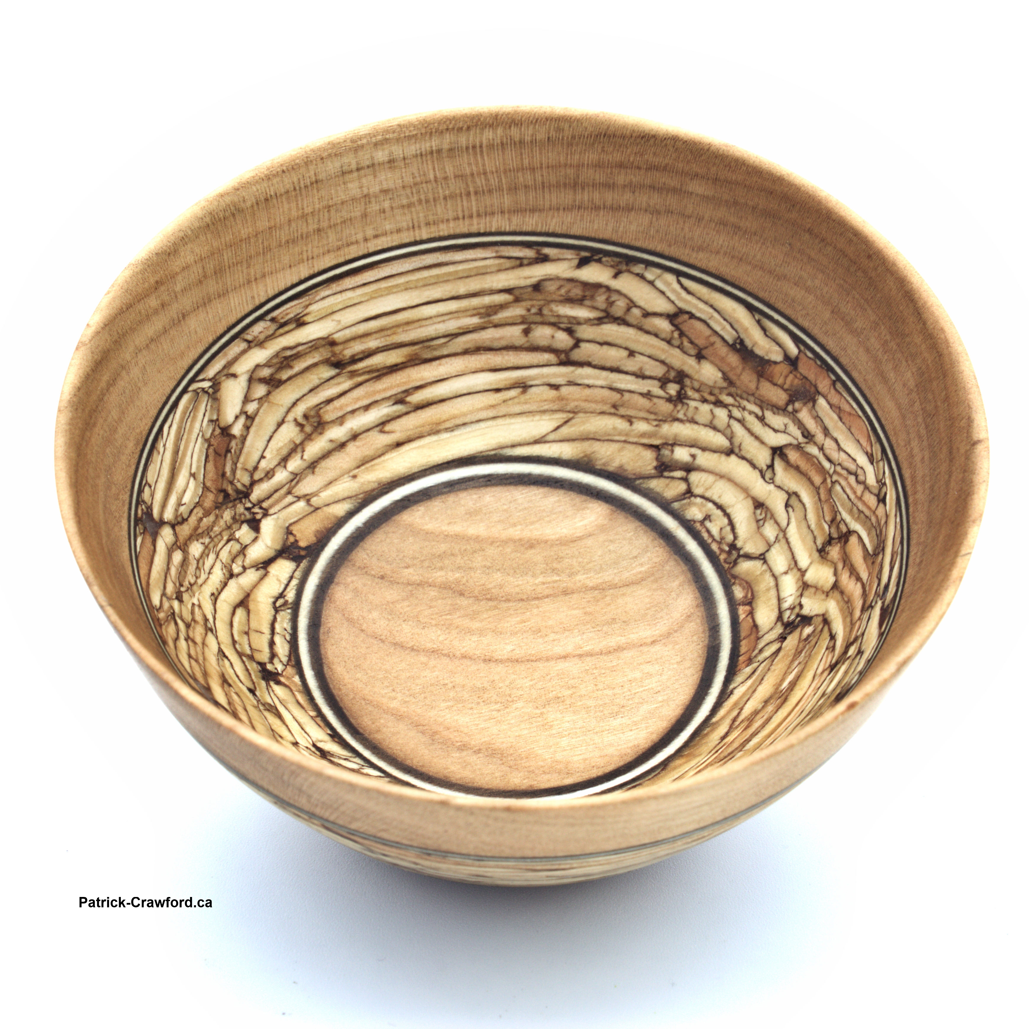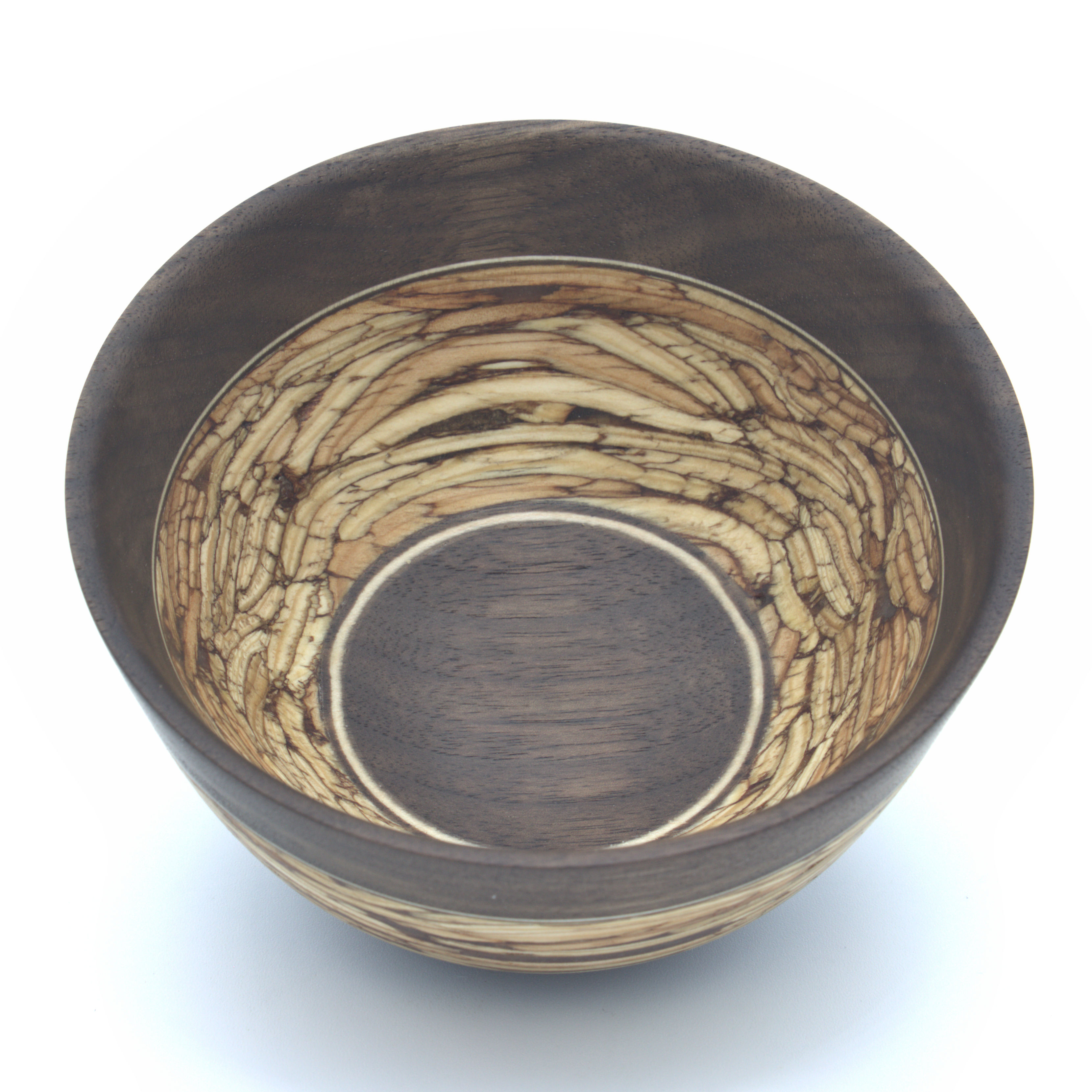Wooden bowls created by laminating layers of different types, grains, and colours of wood together before shaping using either a lathe or scroll saw.